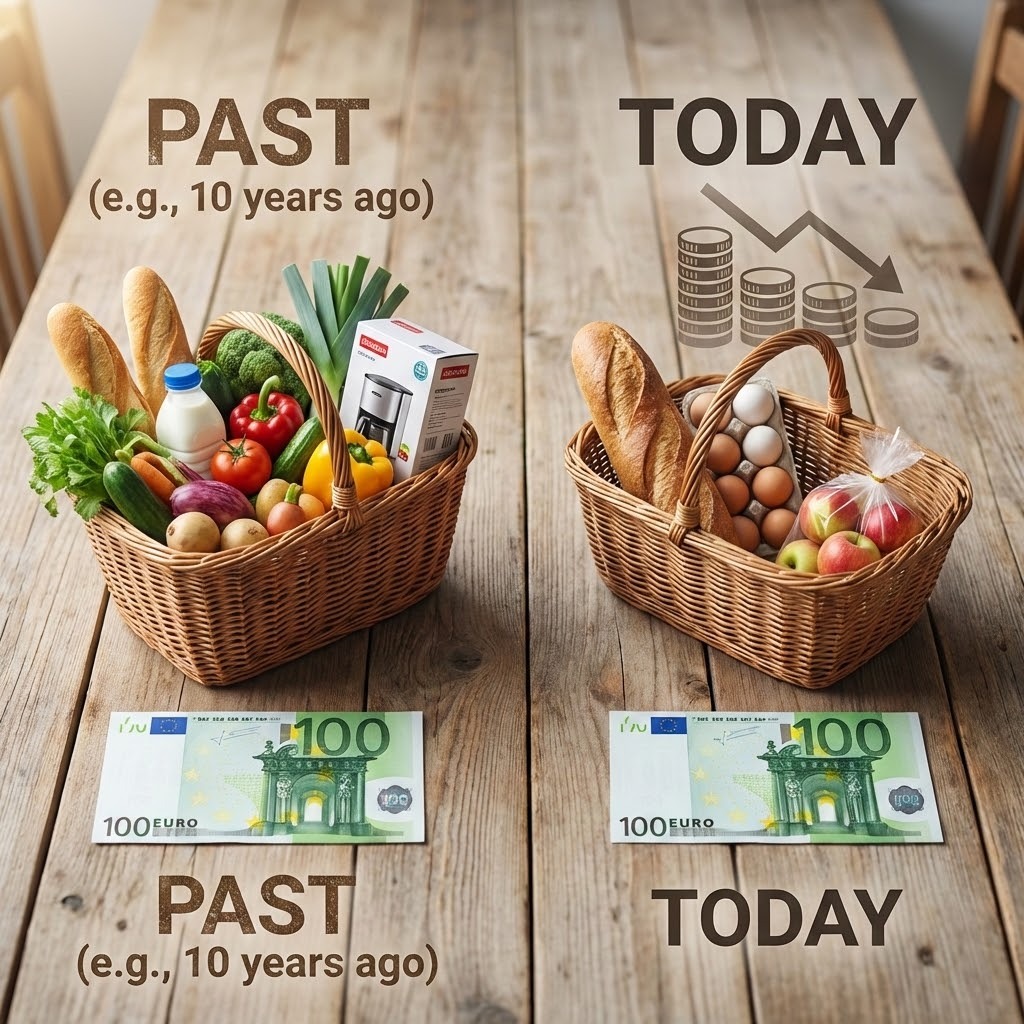 Tämä tarkoittaa, että 100 € tänään ei ole sama asia kuin 100 € kymmenen vuotta sitten. Ilmiö on erityisen tärkeä ymmärtää aikana, jolloin hintataso on noussut nopeasti esimerkiksi energian, ruoan, asumisen ja pakollisen autoilun osalta.